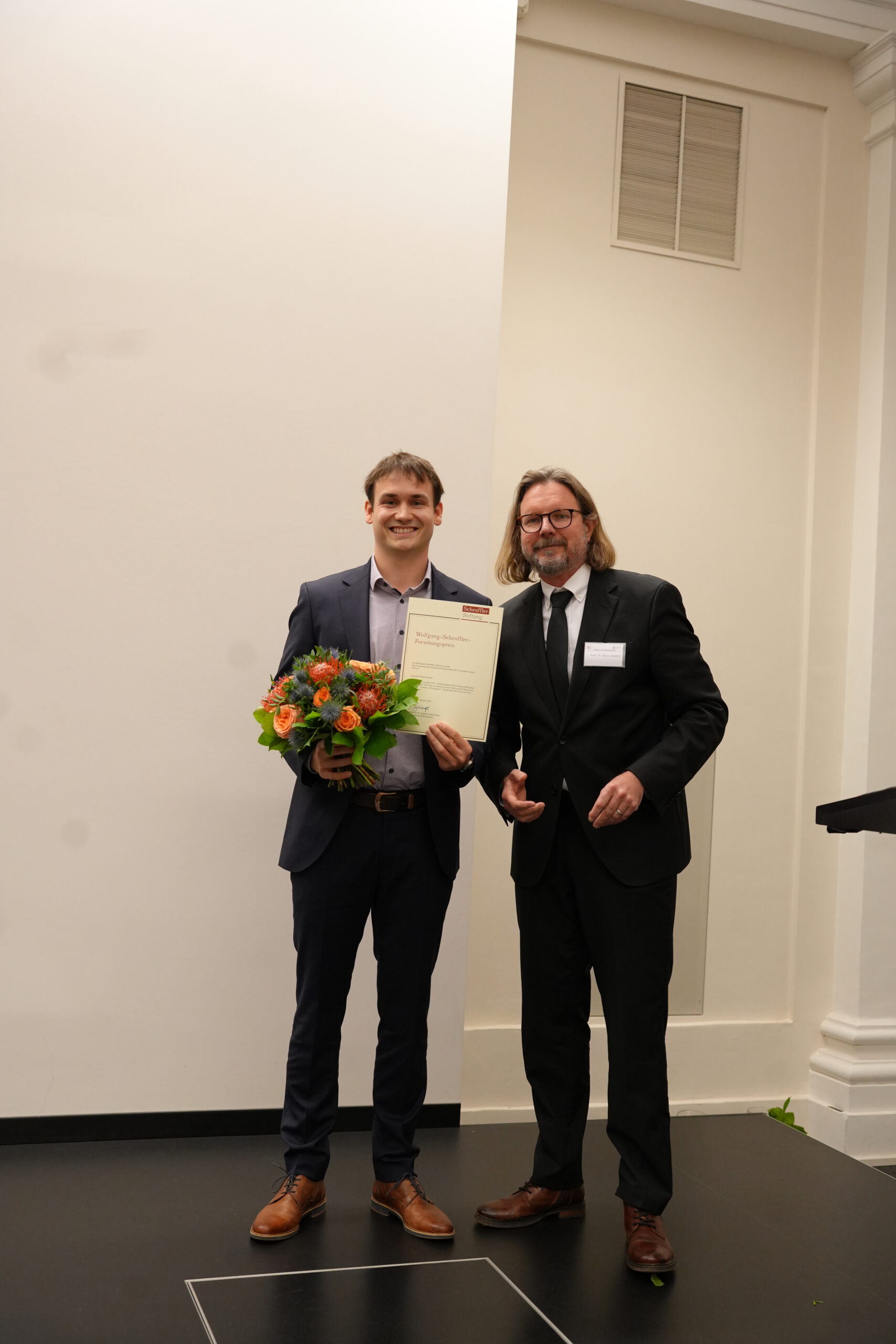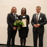Darüber hinaus wurden Dr. Felicite Mugombozi und Leonard Carsten Grunert, Wissenschaftliche Mitarbeitende der Juristischen Fakultät mit Lehrstühlen für Europarecht und Völkerrecht, mit dem Wolfgang-Scheuffler-Forschungspreis geehrt. Die Ehrung nahm Prof. Dr. Marc Desens, Dekan der Juristischen Fakultät, vor. Dr. Felicite Mugombozi stellte im Anschluss Ergebnisse ihrer völkerrechtlichen Forschung zu Interventionsmöglichkeiten in bewaffneten Konflikten vor, insbesondere zu Fragen möglicher internationaler Maßnahmen im Bürgerkrieg in der Demokratischen Republik Kongo.